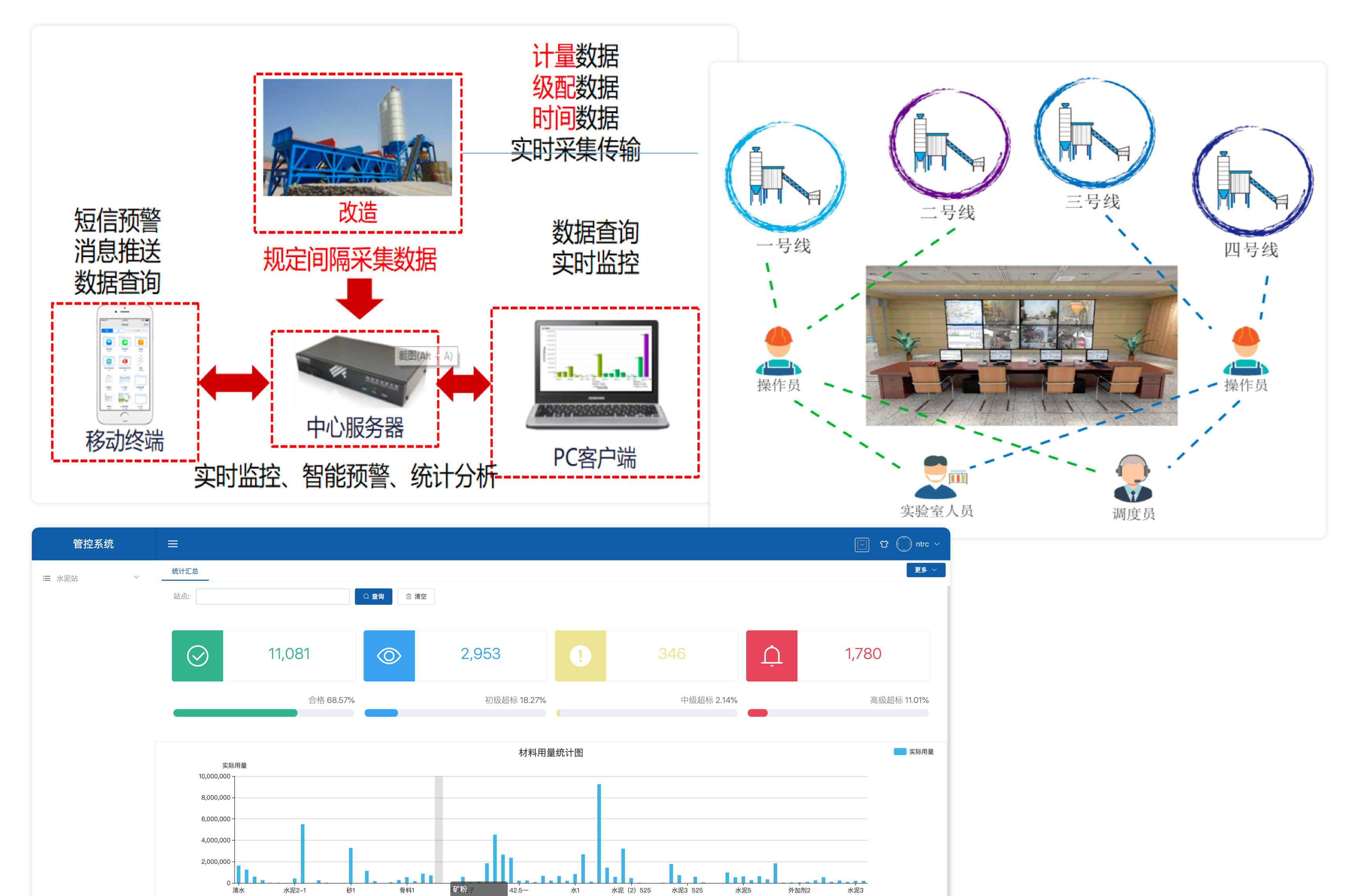 警,實時掌控混凝土、水穩(wěn)、瀝青材料的生產(chǎn)過程,確保出產(chǎn)材料的質(zhì)量達標(biāo)。